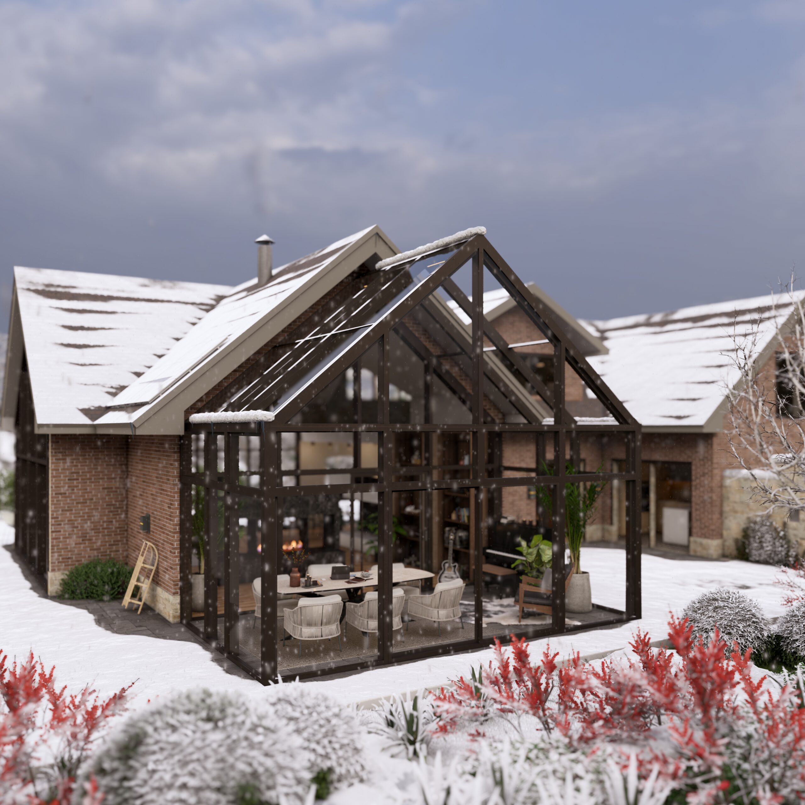 Ogród całoroczny UVEG ARCTIC MULTI z dachem wielospadowym (najczęściej dwuspadowym). Jest w pełni izolowany termicznie z izolowaną, często podgrzewaną posadzką.